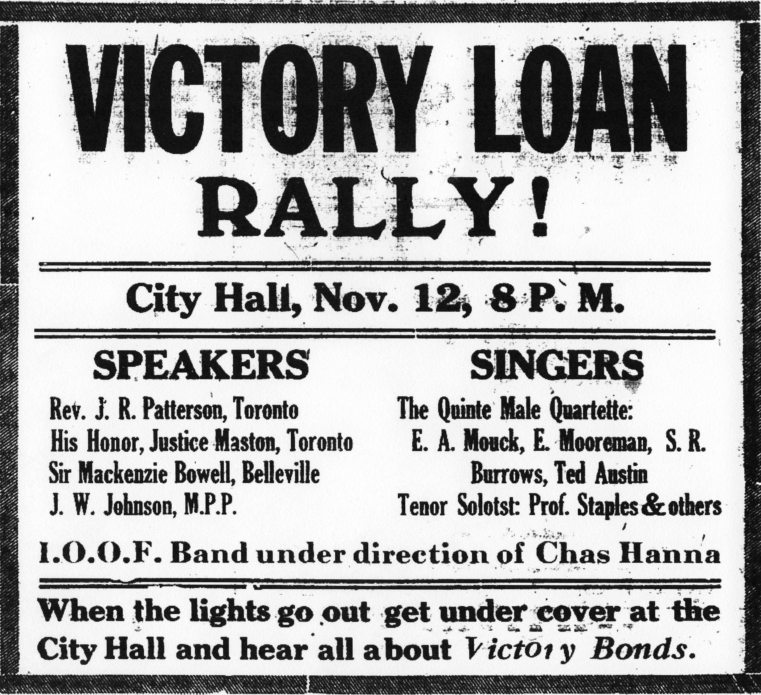 When the lights go out get under cover at the City Hall and hear all about Victory Bonds.”