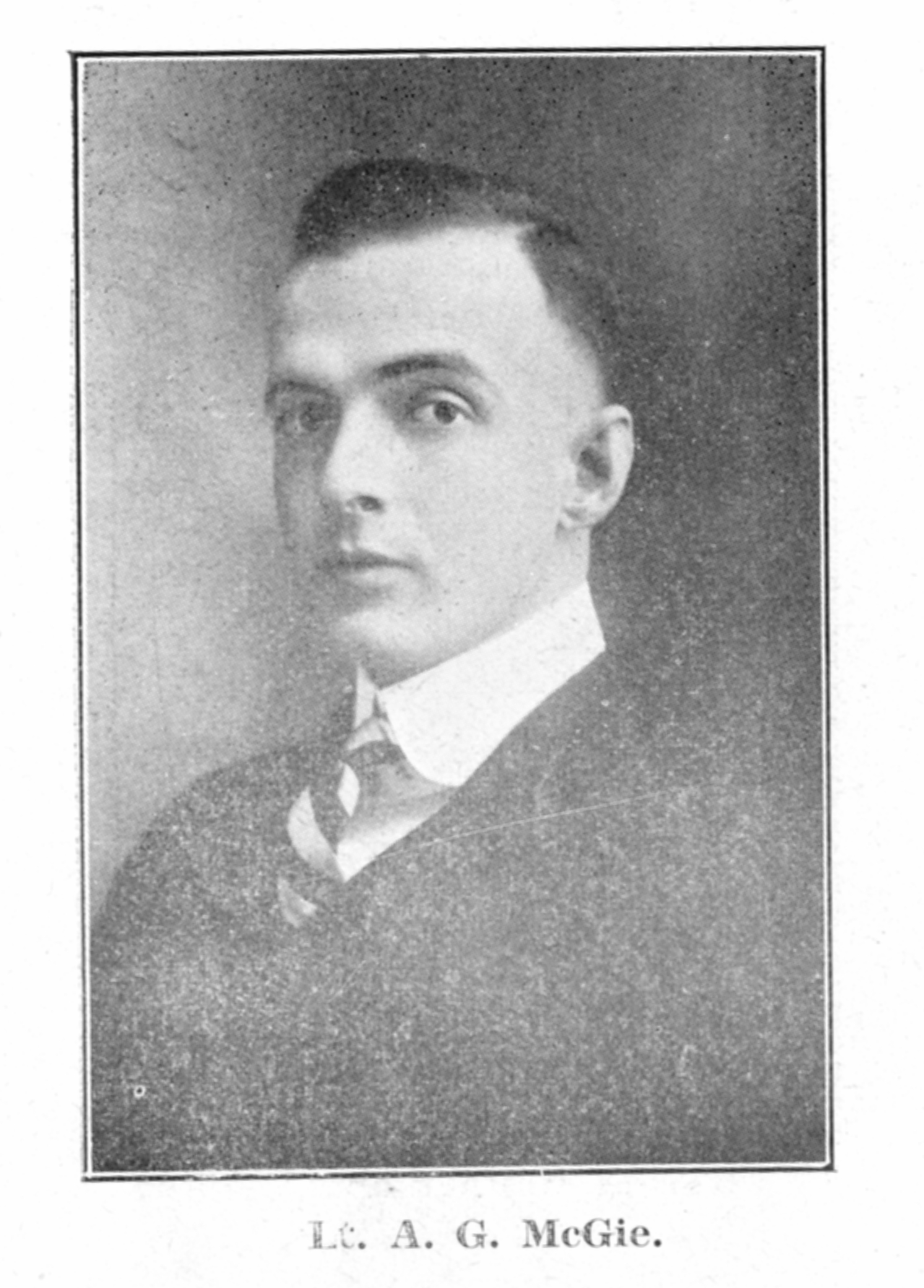 “Lieut. A. G. McGie Gassed by Huns. Mr. A. McGie, 202 Bridge Street, received the following message yesterday morning regarding his son, Lieut. A. Grendley McGie, who went overseas as a machine gun officer of the 155th Battalion.