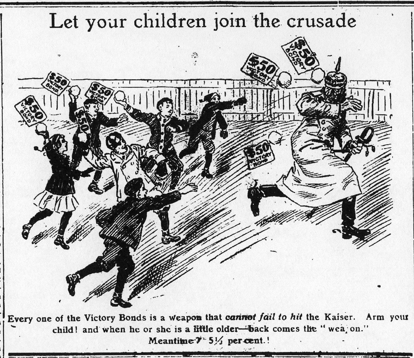 “Let your children join the crusade. Every one of the Victory Bonds is a weapon that cannot fail to hit the Kaiser. Arm your child! And when he or she is a little older—back comes the ‘weapon.’ Meantime 5 ½ per cent!”