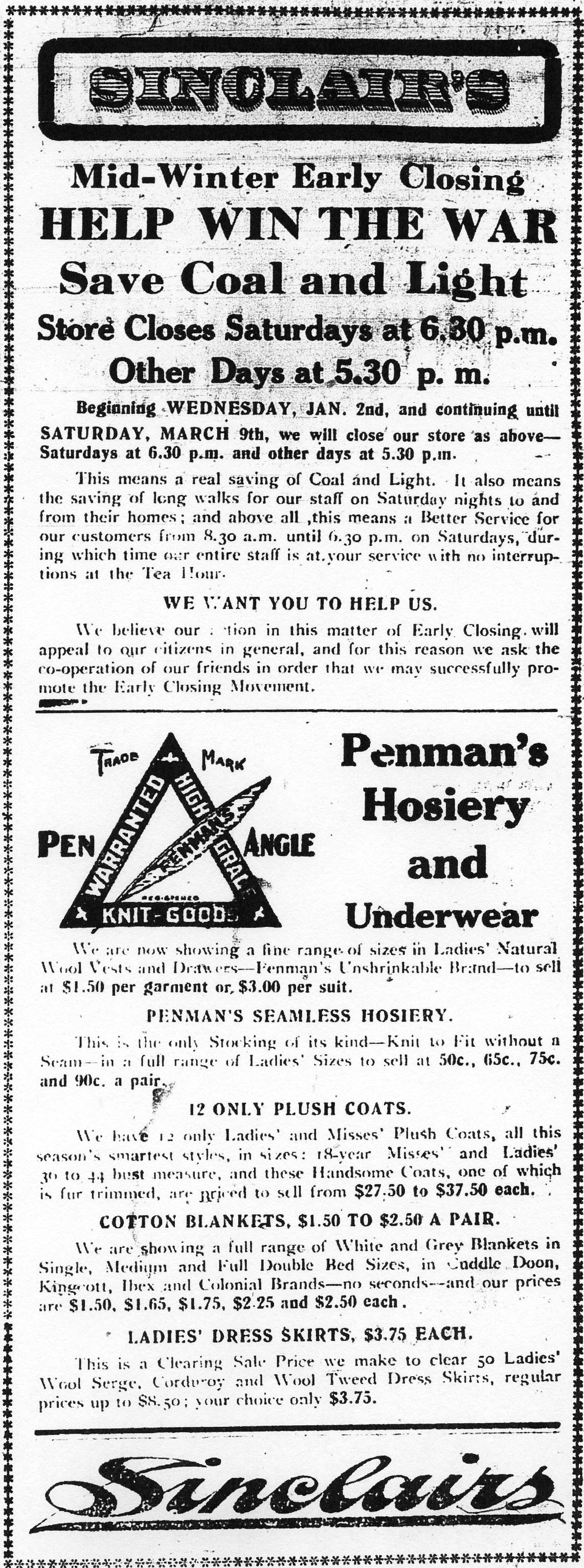 “Sinclair’s Mid-Winter Early Closing. Help Win the War. Save Coal and Light.