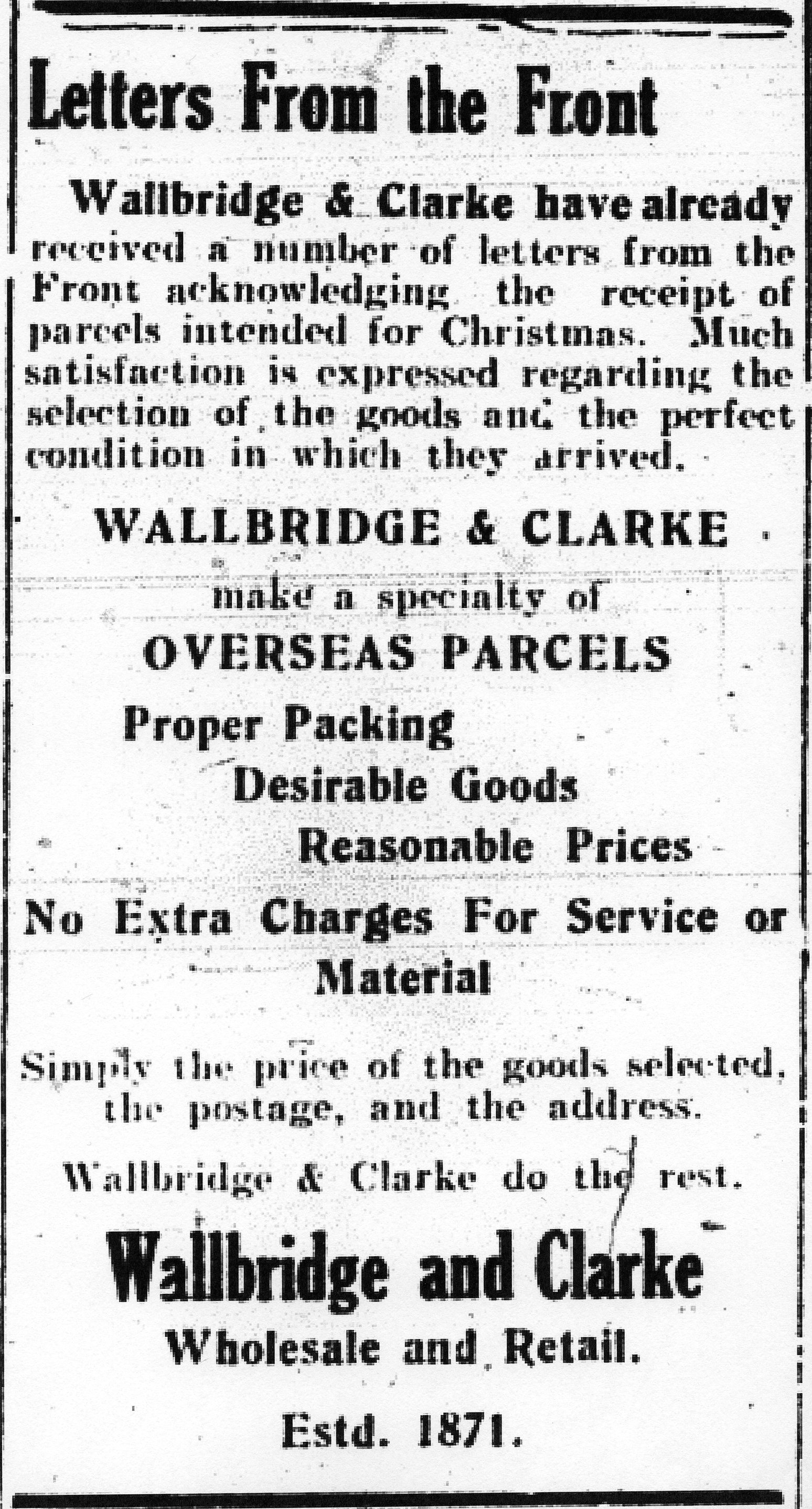 “Letters from the Front. Wallbridge & Clarke have already received a number of letters from the Front acknowledging the receipt of parcels intended for Christmas. Much satisfaction is expressed regarding the selection of the goods and the perfect condition in which they arrived.