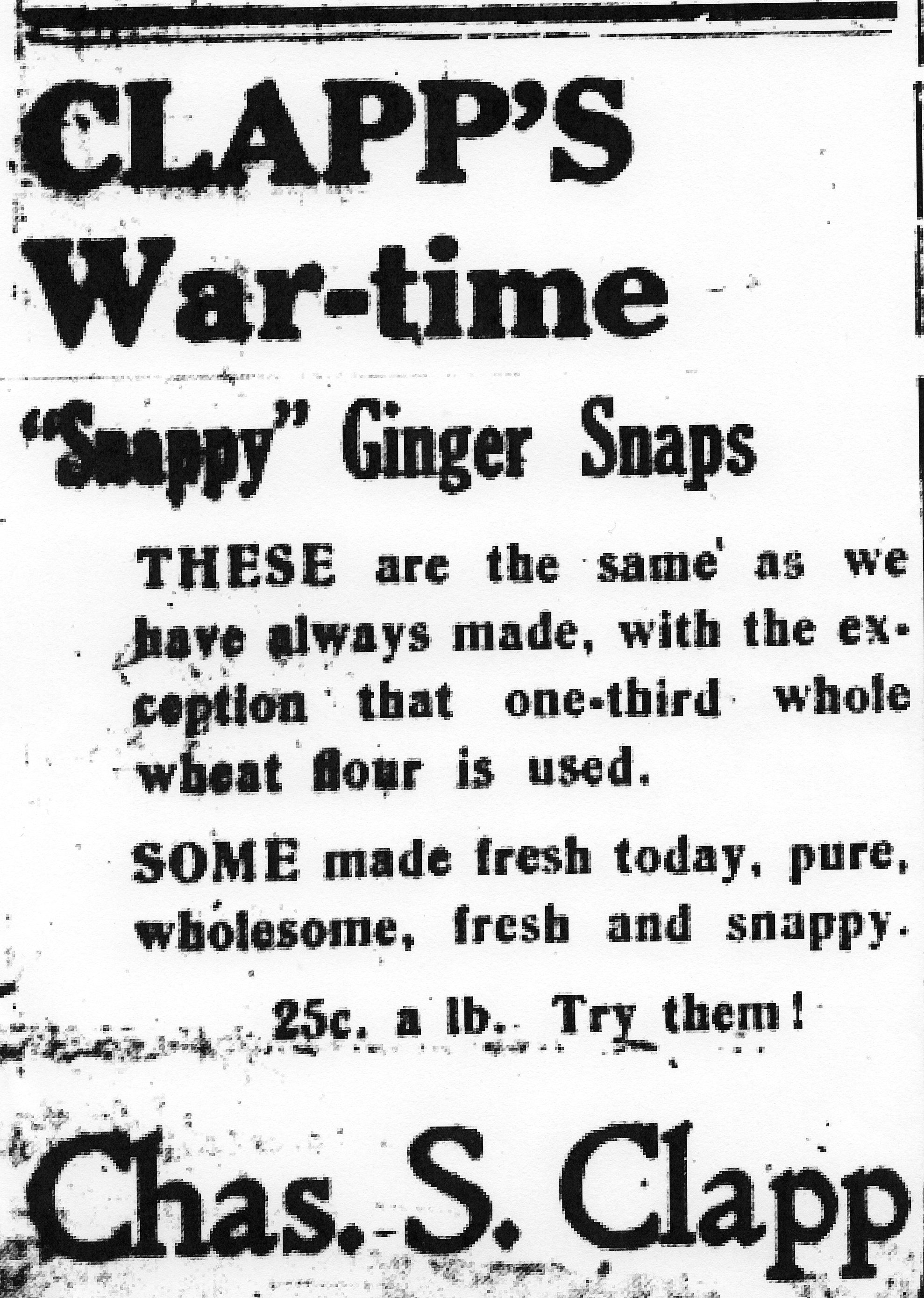 “Clapp’s War-time ‘Snappy’ Ginger Snaps. These are the same as we have always made, with the exception that one-third whole wheat flour is used.