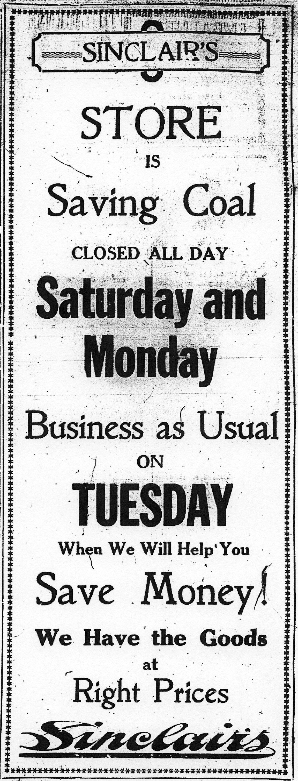 “Sinclair’s Store Is Saving Coal. Closed All Day Saturday and Monday. Business as Usual on Tuesday. When We Will Help You Save Money!