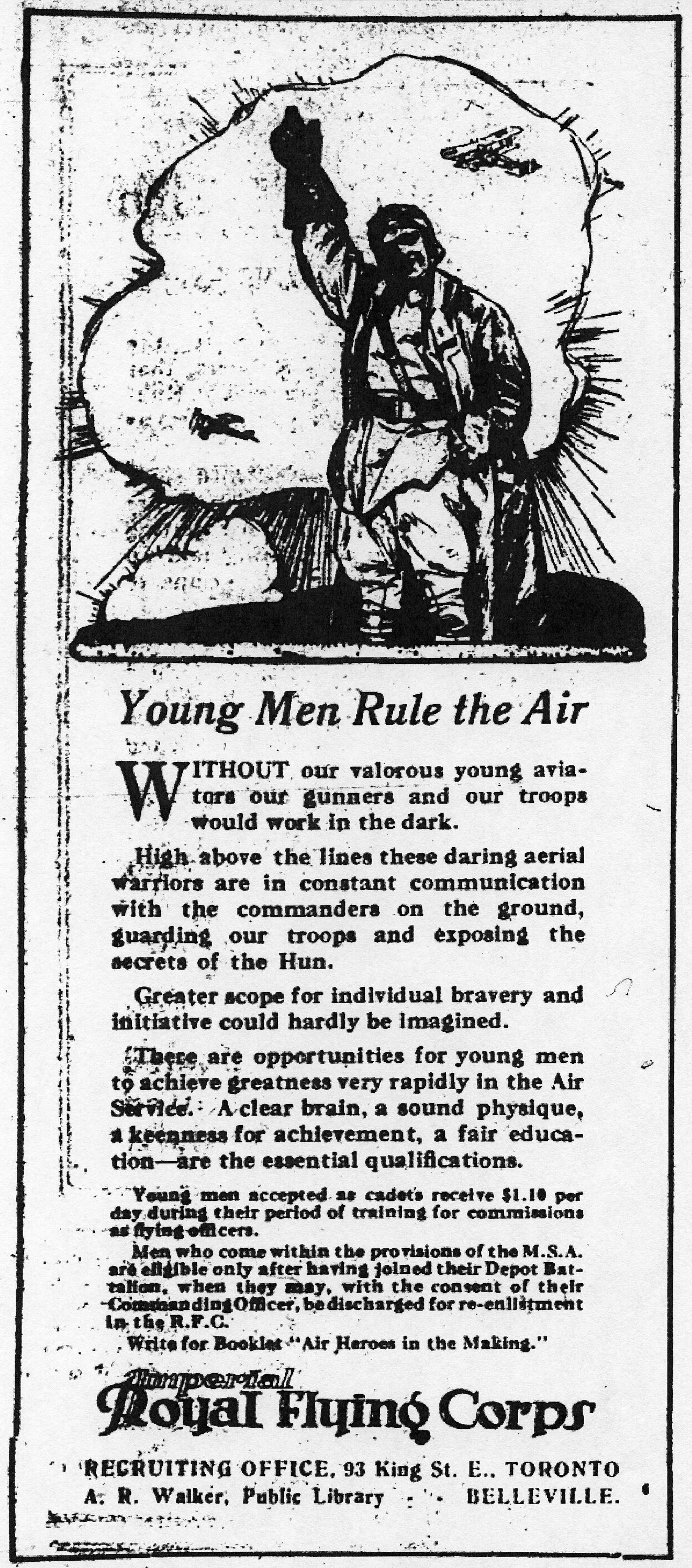 Imperial Royal Flying Corps. Recruiting Office, 93 King St. E., Toronto. A. R. Walker, Public Library, Belleville.”