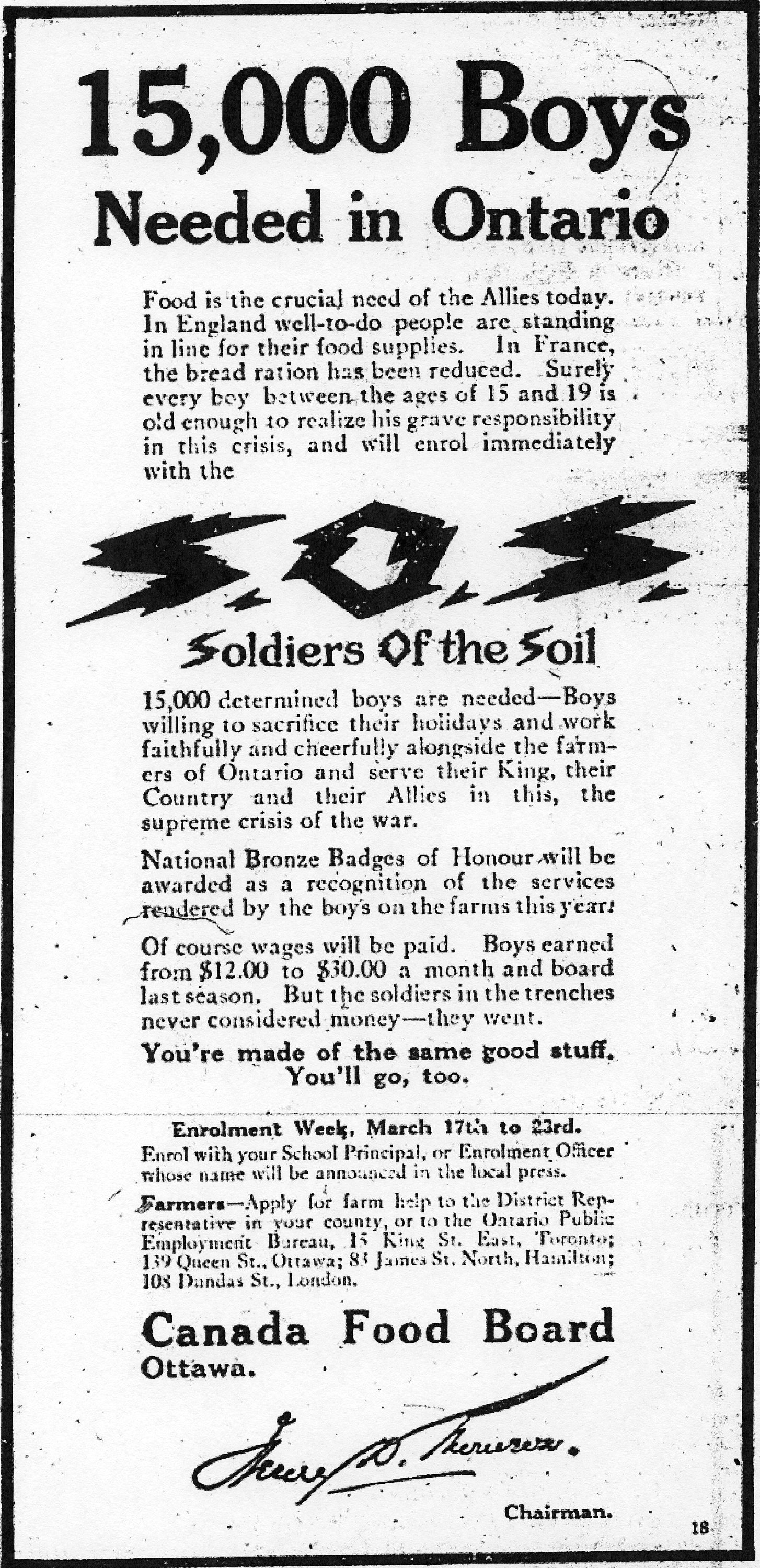 “15,000 Boys Needed in Ontario. Food is the crucial need of the Allies today. In England well-to-do people are standing in line for their food supplies. In France, the bread ration has been reduced. Surely every boy between the ages of 15 and 19 is old enough to realize his grave responsibility in this crisis, and will enrol immediately with the S.O.S. Soldiers of the Soil.