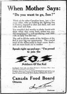 “When Mother Says: ‘Do you want to go, Son?’ Think of the other Canadian boys, just a few years older, who are holding the fighting line in France, exposed to shot and shell, rain and cold, mud and dust. You wouldn’t feel worthy to shake hands with them when they come back unless you, too, did something big—self-sacrificing—and difficult—to help win the war.