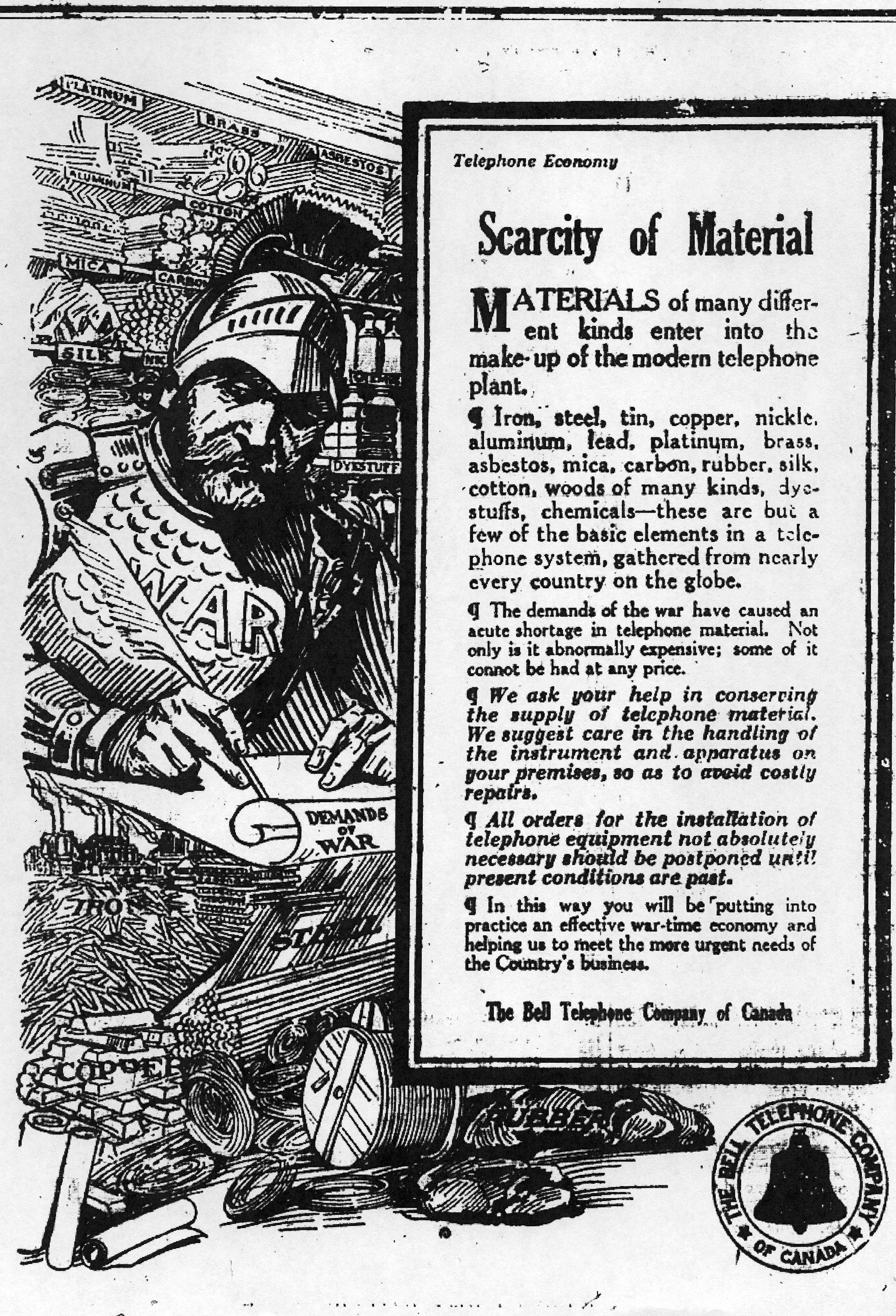 The demands of the war have caused an acute shortage in telephone material. Not only is it abnormally expensive; some of it cannot be had at any price.