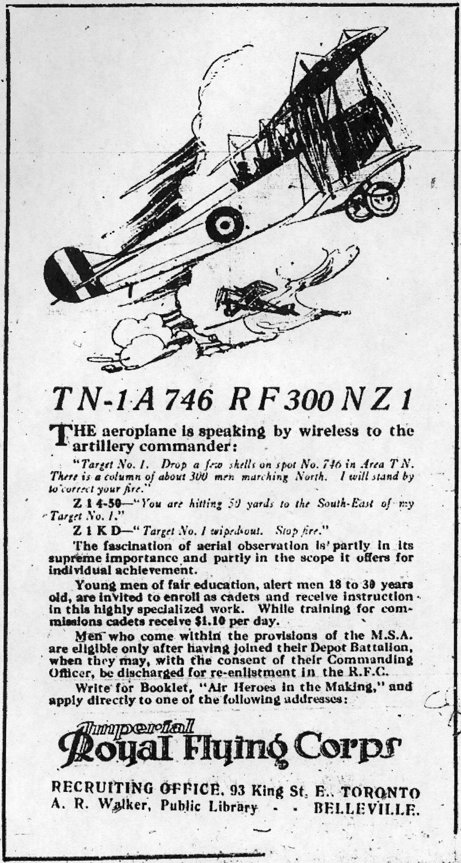 Imperial Royal Flying Corps. Recruiting Office. A. R. Walker, Public Library, Belleville.”