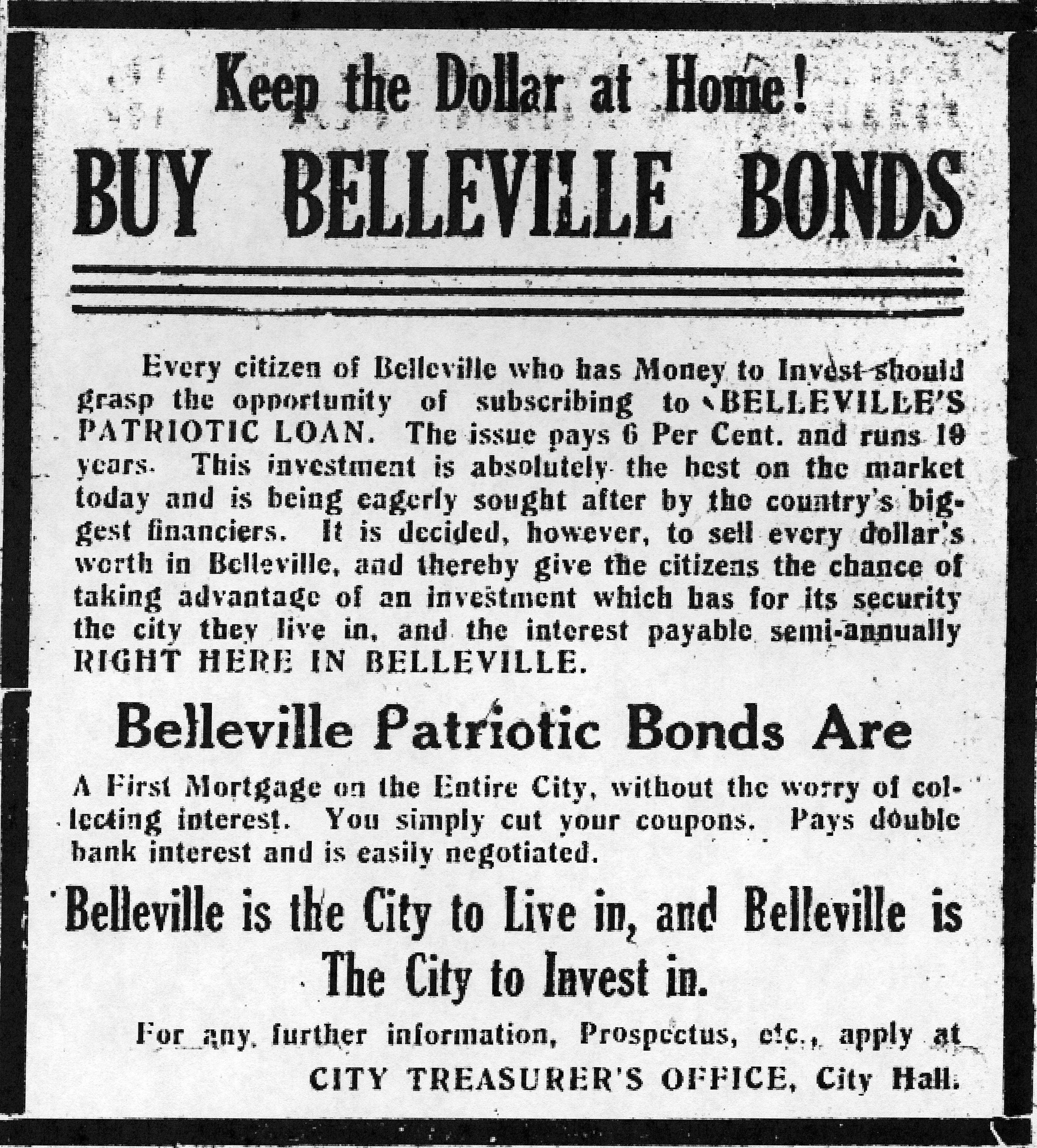 “Keep the Dollar at Home! Buy Belleville Bonds. Every citizen of Belleville who has Money to Invest should grasp the opportunity of subscribing to Belleville’s Patriotic Loan. The issue pays 6 Per Cent and runs 10 years.