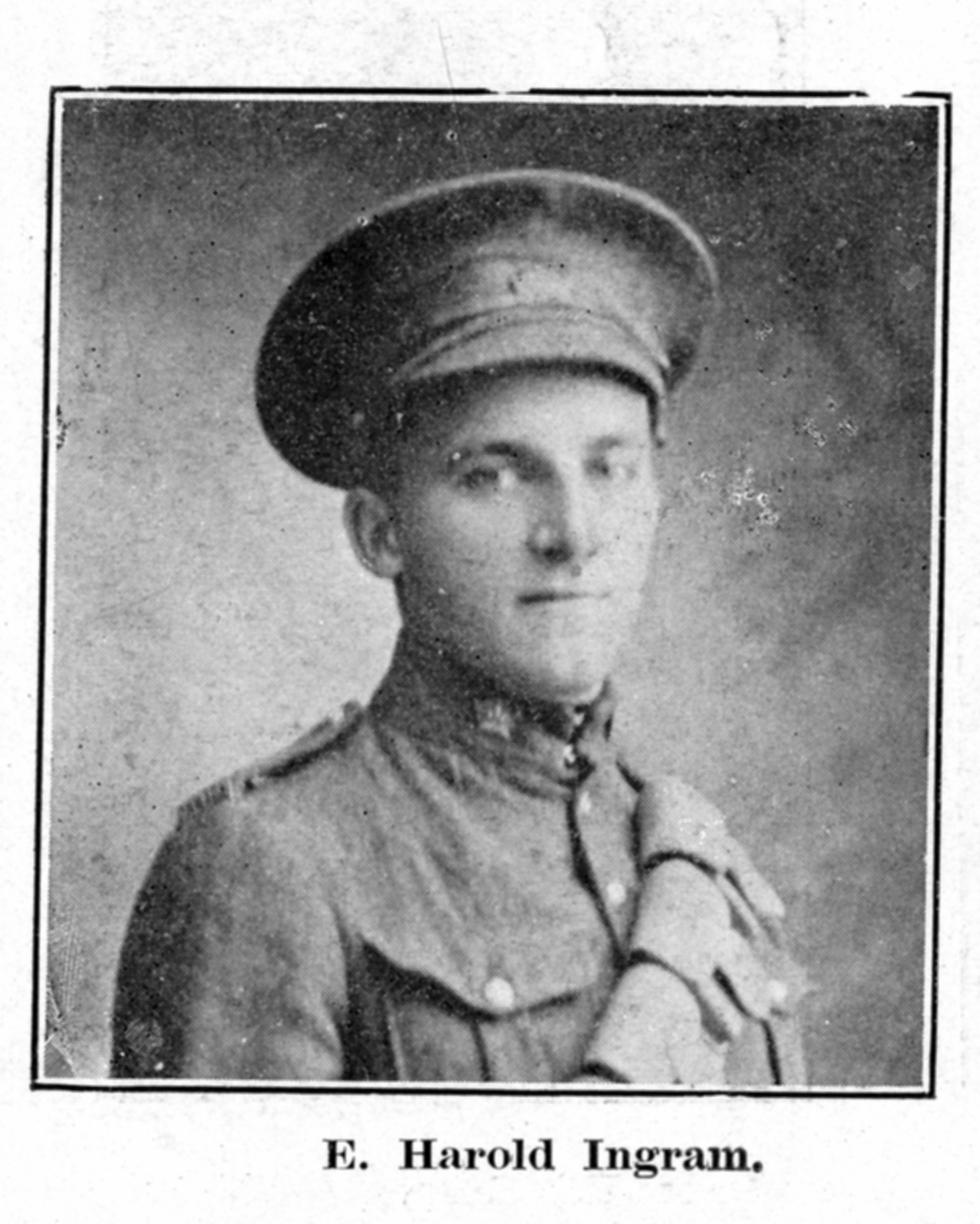 “Bombardier Ingram Wounded. Mrs. Ingram of this city received a telegram from Ottawa which stated that No. 89764 Bombardier E. H. Ingram, admitted Field Ambulance Hospital, April 11th. Gunshot wounds in face, ‘Harold’ was well known in Belleville. He enlisted with the artillery in May, 1915, left for England in September of the same year and has been in France since Christmas of that year. His many friends will hope that his wounds will not prove serious. He is a son of Capt. Ingram formerly of the O. S. D. staff.”
