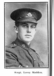 “Returned Home. Sergt. L. G. Madden, Albion Street, arrived home at an early hour Sunday morning. He left here with the 155th Battalion, and was transferred to the 21st Battalion in France, being badly wounded in the right foot at Vimy Ridge and was in different hospitals in England and France for some months. His many friends will welcome him home after an absence of two years full of trials and experiences.”