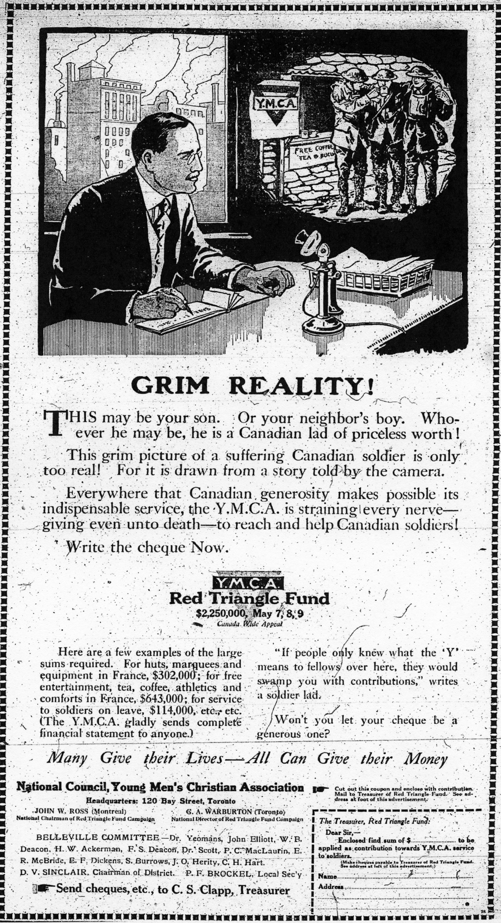 “Grim Reality! This may be your son. Or your neighbor’s boy. Whoever he may be, he is a Canadian lad of priceless worth! This grim picture of a suffering Canadian soldier is only too real! For it is drawn from a story told by the camera.