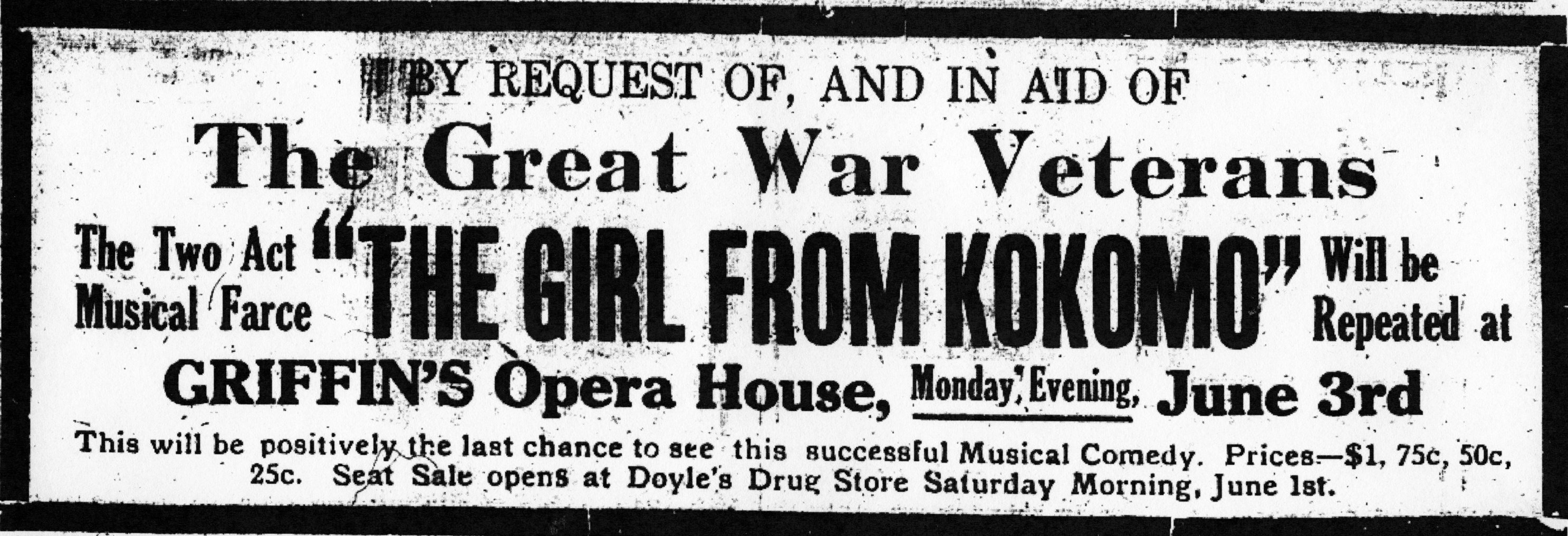 There will be something doing every minute from the time the first monster parade leaves the market square at 11 o’clock in the morning until the curtain rings down on the final act of ‘The Girl From Kokomo,’ which is to be repeated in the Griffin Opera House Monday night in aid of The Great War Veterans. It will be the day of all days for Belleville, and every home and business house should be decorated. Hang out all the flags and bunting you have and put our city in gala attire on ‘Belleville’s Biggest Day.’