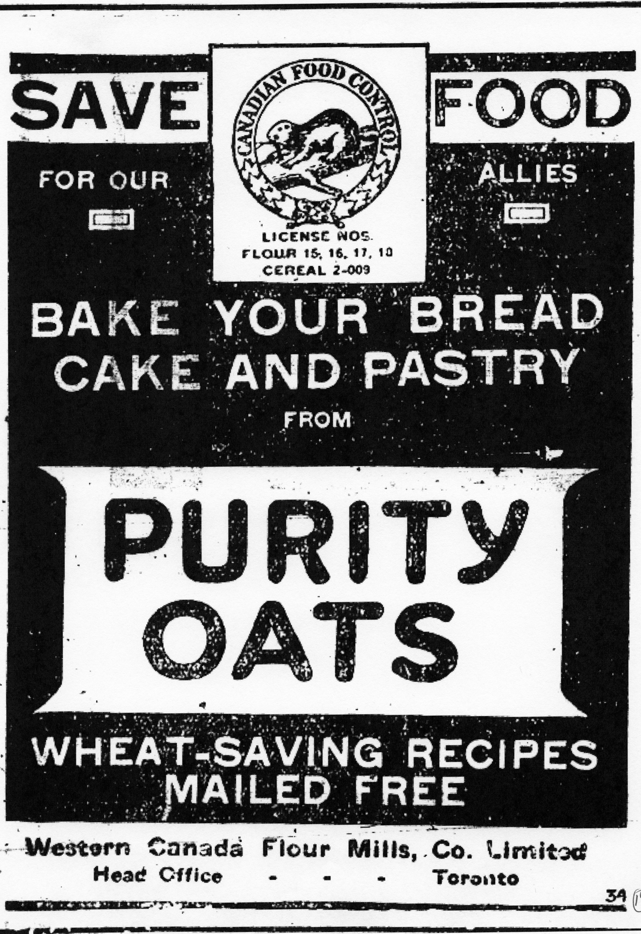 “Save Food for our Allies. Canadian Food Control. License Nos. Flour 15, 16, 17, 18. Cereal 2-009.