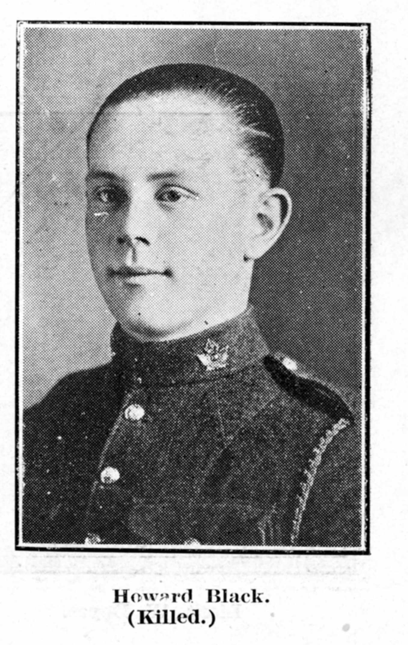 “Pte. Howard Black. This family has been doubly bereaved as this is the second loss within a few days. Frank Sweet was an uncle of Pte. Howard Black, whose death from gun shot wounds was previously announced. Howard was a bright and promising student. He received his education at Queen Mary School and was a pupil of the High School when he enlisted at the age of 16 in the bugle band of the 155th Battalion. He was with this battalion while it was in camp at Barriefield, but did not go overseas with it as he was too young.