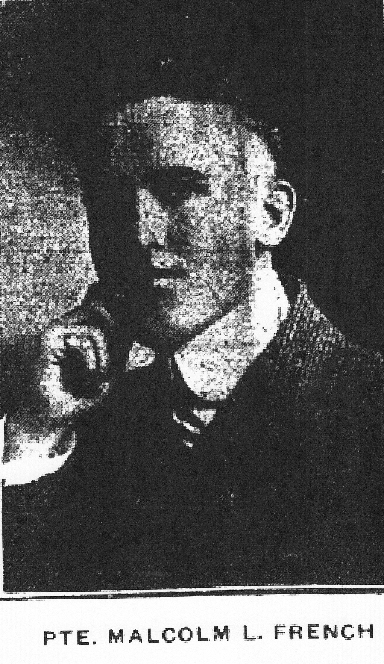 “Pte. Malcolm L. French only child of Mr. and Mrs. Gilbert H. French, West Bridge Street, killed in action in France, Aug. 30th, 1918. Previous to enlisting he was a pupil of Belleville High School.”