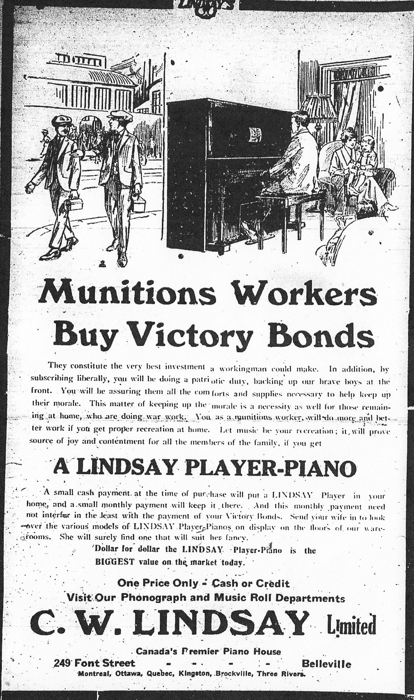 Visit Our Phonograph and Music Roll Departments. C. W. Lindsay Limited. 249 Front Street, Belleville.”