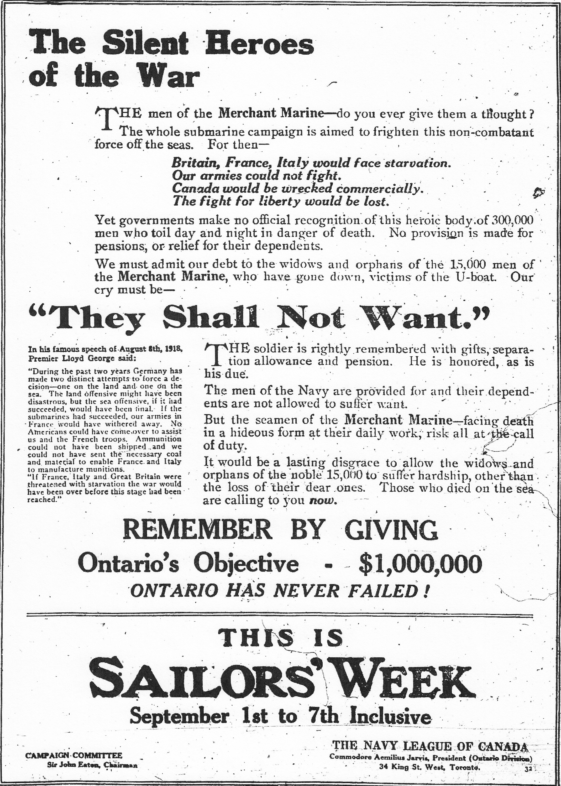 “For the Widows and Orphans. This is the last day of Sailors’ Week and the fund for the widows and orphans is still far below what it should be. Contributions can be left at the office of Mr. Alexander Ray, Front street, this evening for this worthy object. It is a privilege to help the families of the heroes who have died serving Canada.”