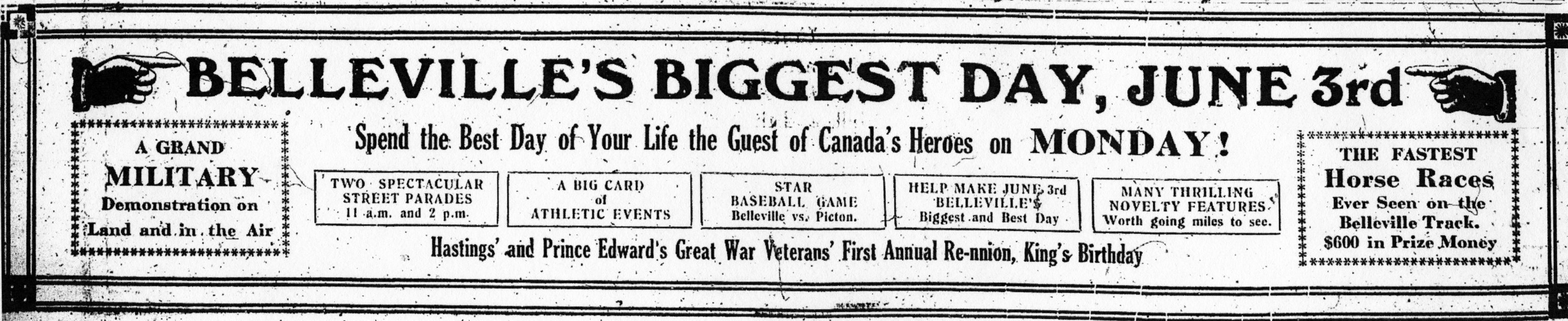 “Belleville’s Biggest Day, June 3rd. Spend the Best Day of Your Life the Guest of Canada’s Heroes on Monday!