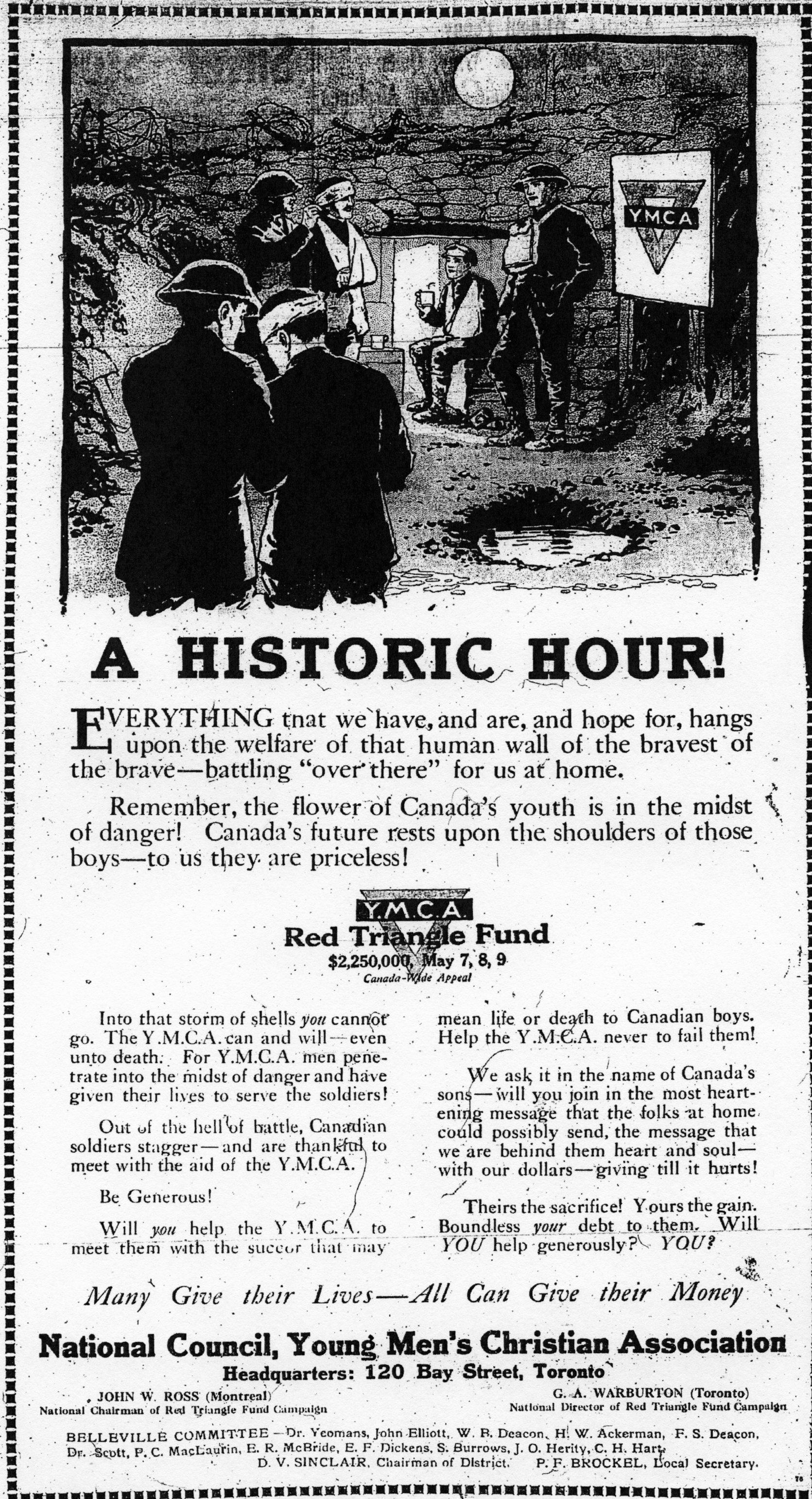 “Bombardier Ingram Wounded. Mrs. Ingram of this city received a telegram from Ottawa which stated that No. 89764 Bombardier E. H. Ingram, admitted Field Ambulance Hospital, April 11th. Gunshot wounds in face, ‘Harold’ was well known in Belleville. He enlisted with the artillery in May, 1915, left for England in September of the same year and has been in France since Christmas of that year. His many friends will hope that his wounds will not prove serious. He is a son of Capt. Ingram formerly of the O. S. D. staff.”