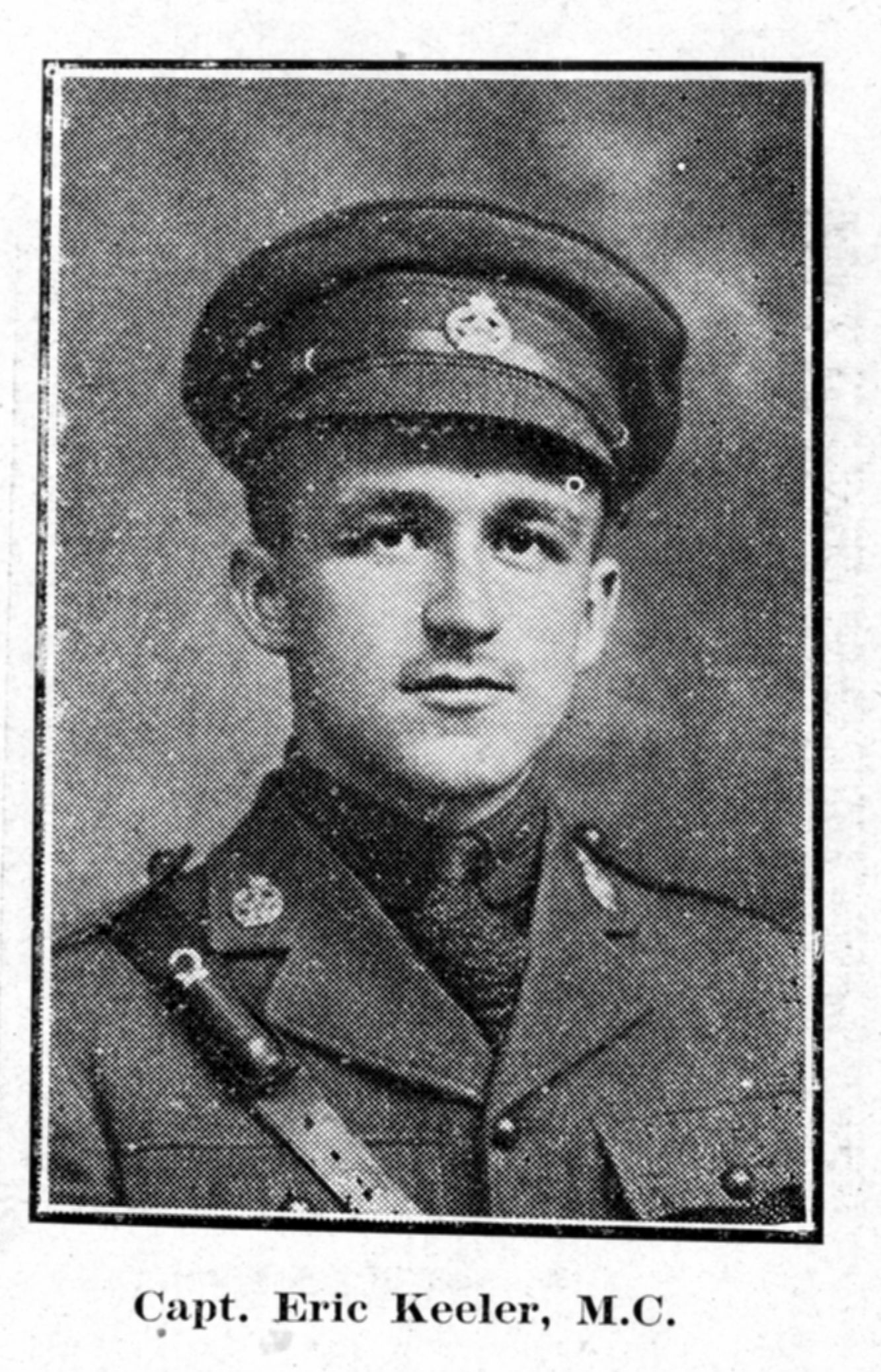 “Awarded Military Cross. Another Belleville boy has won distinction at the front, by acts of bravery on the field of battle. Mr. E. O. Keeler, chief despatcher of the G. T. R. here, is in receipt of a letter from his son, Eric O. Keeler, which states he had been decorated with the Military Cross. The recipient is a young man who is well known in this city. He enlisted and went overseas with the 207th Battalion of Ottawa which unit was broken up in England and subsequently merged with the 38th Battalion. Previous to enlistment he was employed in the Post Office here. The many friends of the young man will be pleased to learn of the distinction which has been conferred upon him.”
