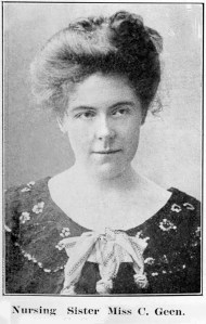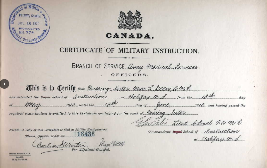 She was educated locally and was a graduate of the Nursing School at St. Luke’s Hospital in Utica, New York about 1906. Here she continued to practice her profession until she enlisted in the Canadian Army Medical Corps on January 6, 1916 in Kingston.